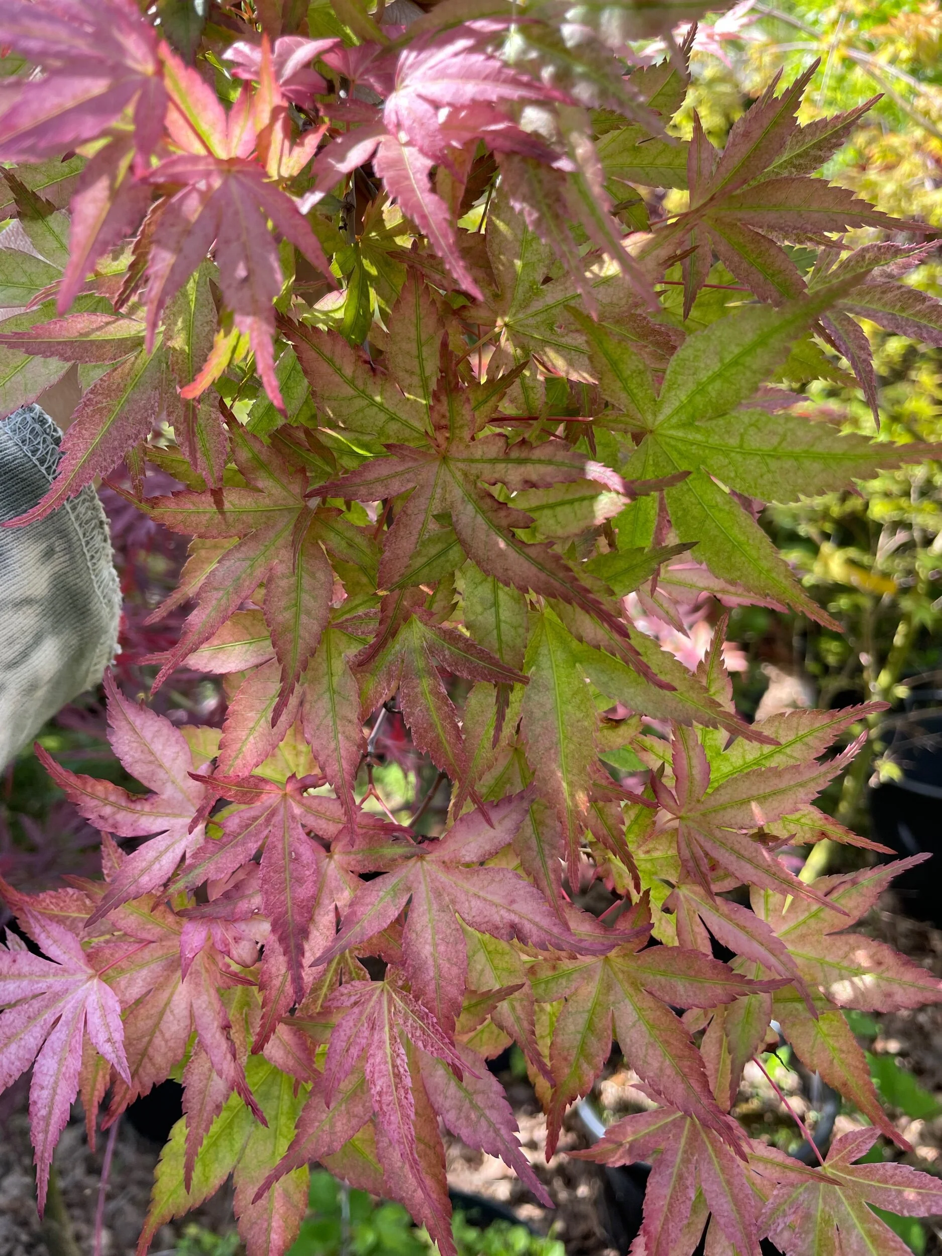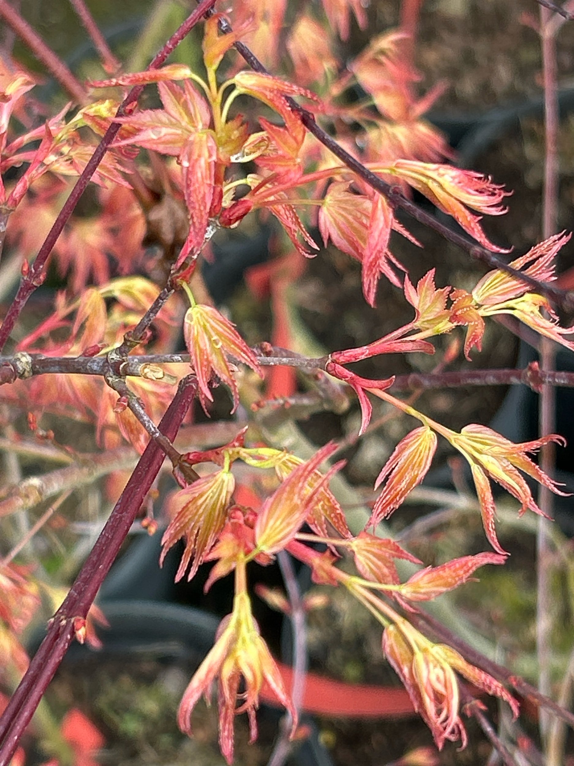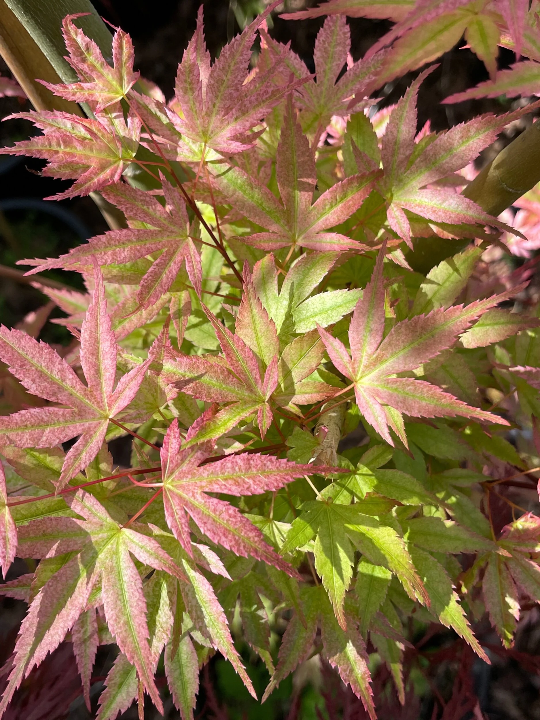 A small leafed variety with a spring colour or orange/red fairing to a yellow edge and mottled leaf. This is a very sort after Japanese maple.
